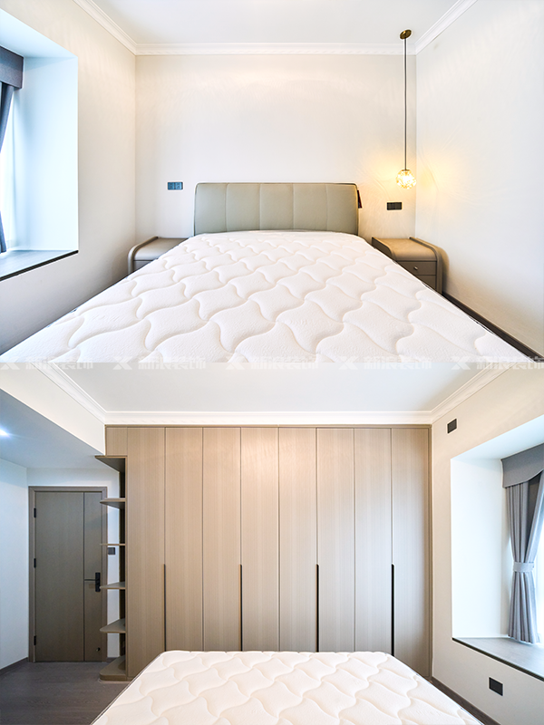 卧室采用一门到顶设计,衣柜柜体柜门同色,简约耐看,内部根据使用习惯做衣物被褥分区,收纳轻松拿下。