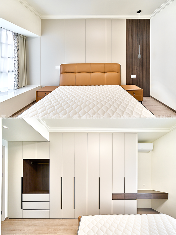 主卧的床尾位置做整墙衣柜,镂空的挂取区可以挂取日常衣物。穿插式的设计做梳妆台,满足了主人日常的各种需求。
