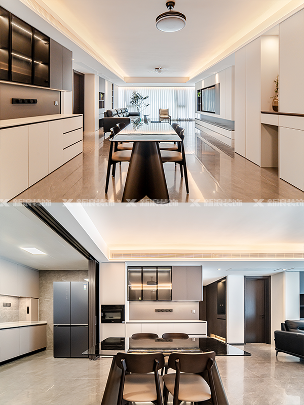 餐厅做了两组柜子,一组西橱柜让生活更便利,对面的展示柜也增加了储物。房间都做了护墙板作为装饰。