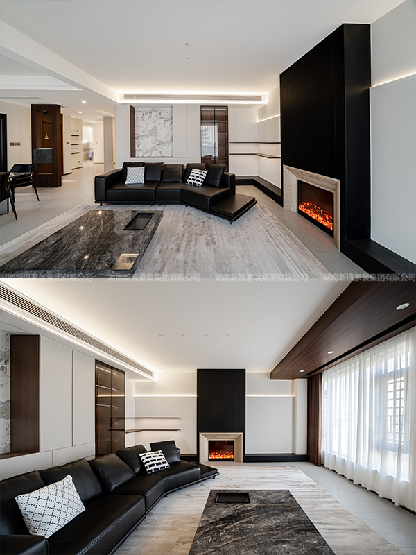 氛围造型壁炉搭配浅棕气质地毯,黑色背景纵向拉伸视觉,居于其中简直像走进杂志拍摄现场,超美的~