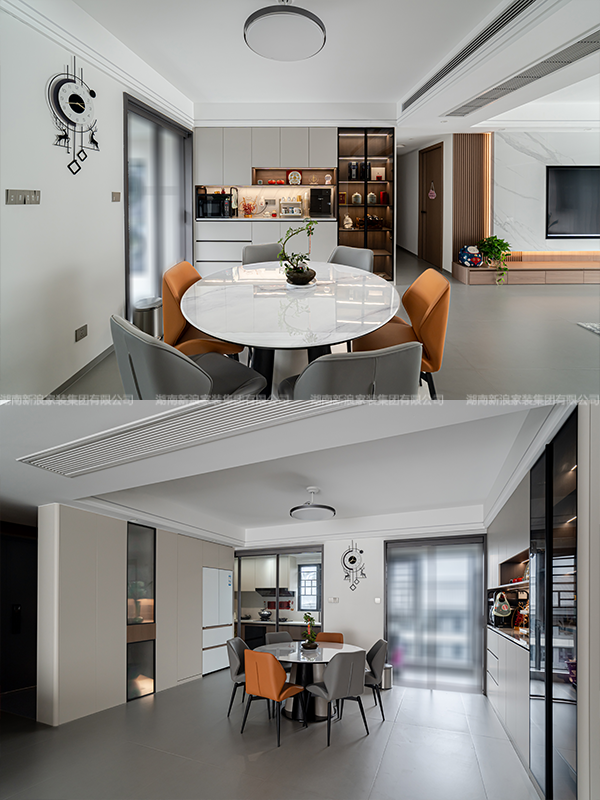 开放式布局: 客餐厅一体化是最常见的设计,最大化地利用空间,增进家人间的互动。
