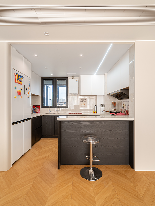 开放式厨房为整个家注入灵魂!操作台面宽敞又明亮,中古风的橱柜设计,实用还自带独特韵味。