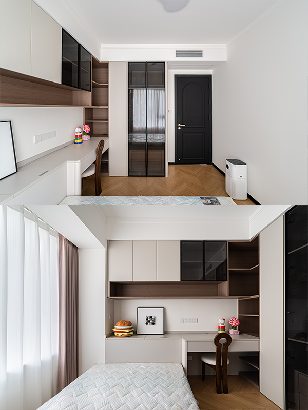 阳台门垛用撞色展示层板设计包住,不突兀且富有艺术设计感。