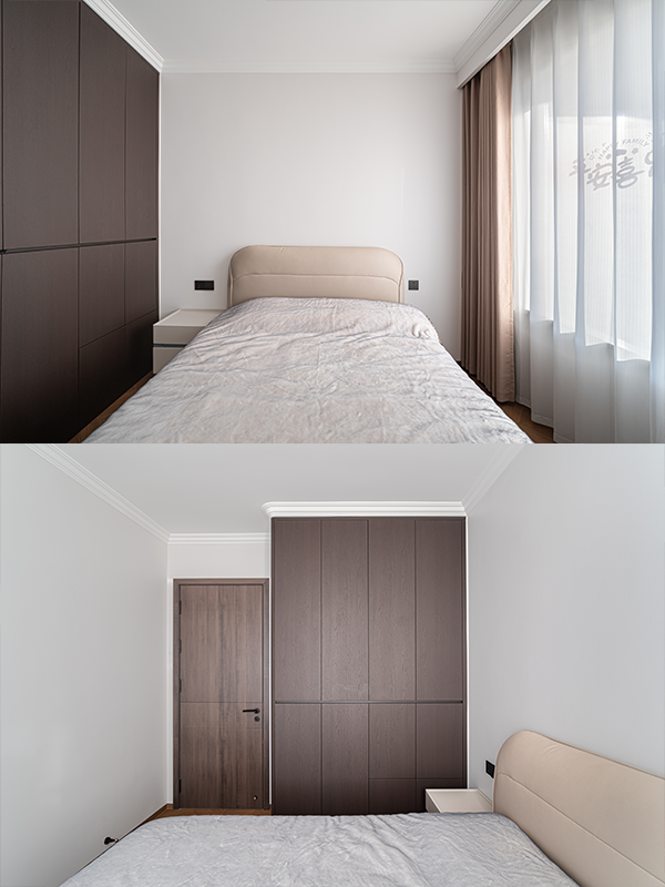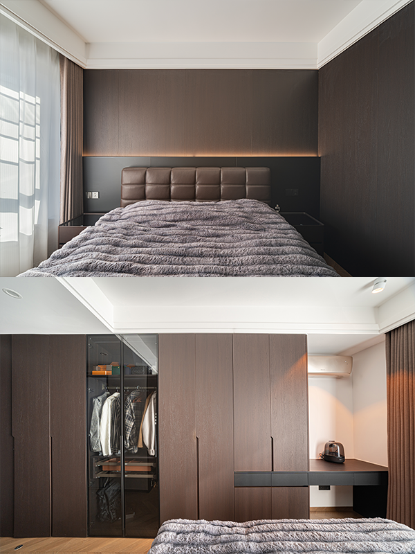 最惊喜的是主卧!墙板做到全房,木色+黑色半墙背景墙,搭配皮质床头,质感拉满。床尾一门到顶大衣柜,免拉手柜门和玻璃柜门结合,有呼吸感,收纳力也拉满