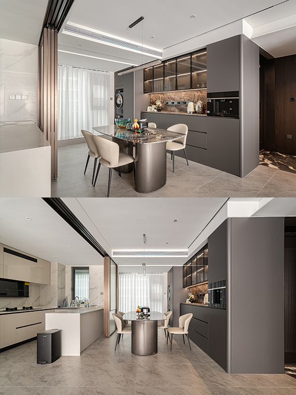 摒弃繁杂隔断,客厅、餐厅、厨房流畅贯通,构建开放格局。光线自由穿梭,让空间呼吸,人与人的交流也因无界布局