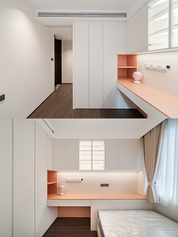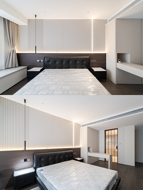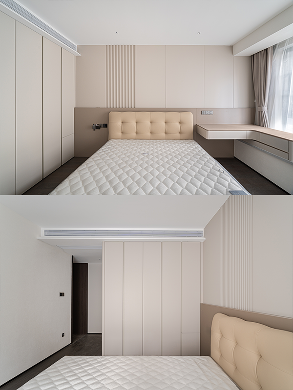 同时呼应墙面的墙板和隐形门,做到门墙柜整体一体化设计,实用与美观兼具更显亲昵自然,家的温馨与互动感拉满。